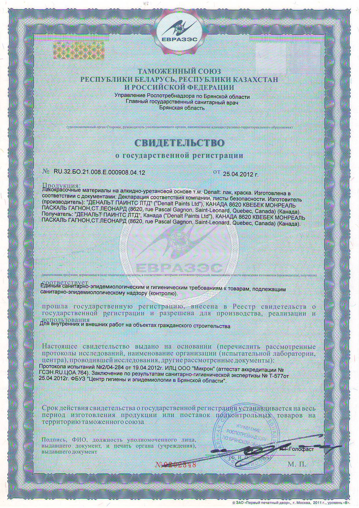 Свидетельство о государственной регистрации RU.32.БО.21.008.Е.000908.04.12 от 24.04.2012 г.